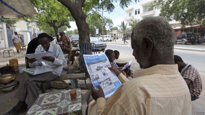 FILE - People read newspapers in the streets of Somalia's capital Mogadishu May 3, 2011. Popular Somali newspaper Xog-Ogaal remains closed and its editor in detention for a second day.