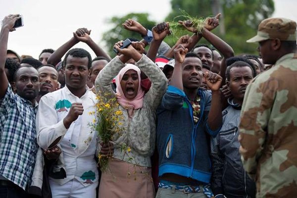 Residents of Bishoftu crossing their wrists above their heads as a symbol for the Oromo anti-government protesting movement during the Oromo new year holiday Irreechaa in Bishoftu on October 2, 2016/Peace might be soon restored. PHOTO | NATION MEDIA GROUP