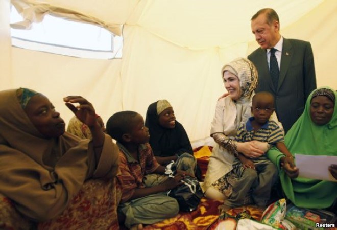 FILE - Turkey's Prime Minister Recep Tayyip Erdogan (top) and his wife Emine Erdogan visit a camp for displaced people in Mogadishu, Aug. 19, 2011.