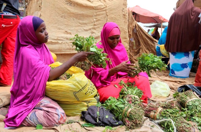A woman and her daughter arrange branches of khat into small bundles in Mogadishu on Aug. 9, 2014. Grown on plantations in the highlands of Kenya and Ethiopia, tons of the leafy stimulant, dubbed 'the flower of paradise' by its users, are flown daily into Mogadishu for distribution to markets across Somalia. | REUTERS