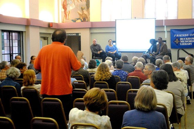 A local educator voices his concerns of ignorance in the community during Thursday night's refugee panel. (Gunnar Olson/ Daily News)