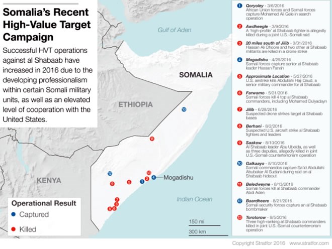 The campaign against Somali Islamist militia al Shabaab has taken a turn this year. Thanks to increasing professionalism among some units of the Somali military, which has led to better intelligence operations and heightened cooperation with U.S. special operations forces, strikes have occurred more frequently against high-value targets (HVTs) in al Shabaab. But despite the security forces' recent successes, the Islamist group still poses a significant security threat. Not only does it continue to launch terrorist attacks in Mogadishu and beyond, but it also regularly amasses forces capable of chasing Somali army and African Union troops from their positions in southern Somalia.
