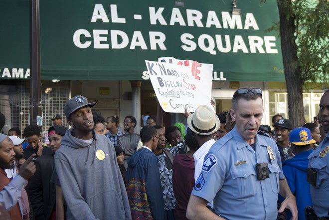 Protesters gather near the stage where K'naan performed on Saturday, Sept. 10, 2016 in the Cedar- Riverside neighborhood. K'naan was escorted away by security after protesters disrupted his performance. At at least 3 attendees were detained. Photo by: Easton Green