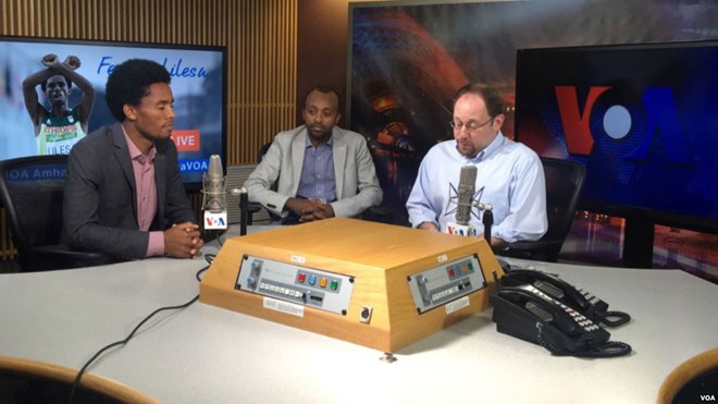 Ethiopian runner, silver medalist in Rio Olympics Feyisa Lilesa (L), his translator, and VOA reporter Dan Joseph at the Voice of America in Washington, Sept 15, 2016. (Photo: Rudan Balay / VOA)