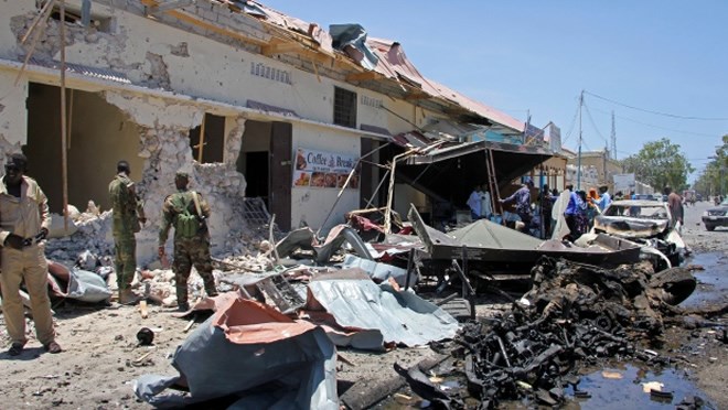 Somali security forces attend the scene of a car bomb attack on a restaurant in Mogadishu, Somalia, on Wednesday. (Farah Abdi Warsameh/Associated Press)