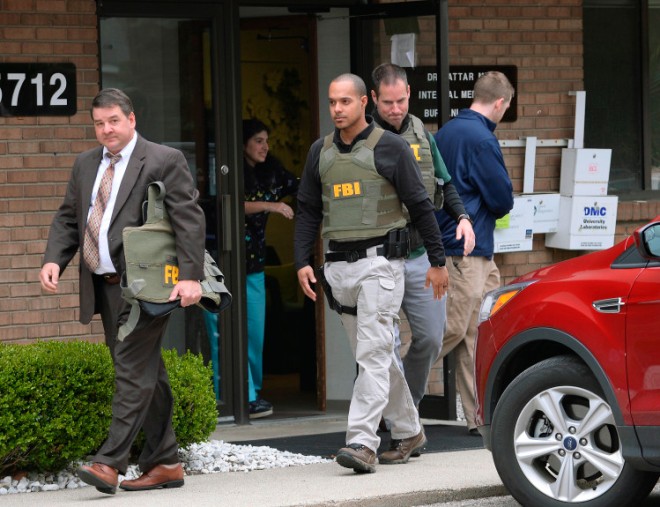 FBI agents leave the office of Dr. Fakhruddin Attar at the Burhani Clinic in Livonia, Mich. Friday, April 21, 2017, after completing a search for documents. The investigation is connected to the case of Dr. Jumana Nagarwala, of Northville, charged with performing genital mutilation on two young girls from Minnesota. (Clarence Tabb Jr. /Detroit News via AP)