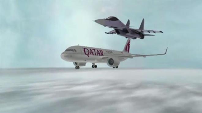 At one point in the video, an animation of a rocket is seen being fired at a Qatar Airways plane.