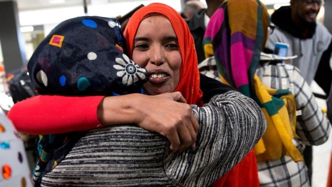 Somali Najma Abdishakur (centre) was welcomed by her mother at Washington Dulles International Airport. EPA