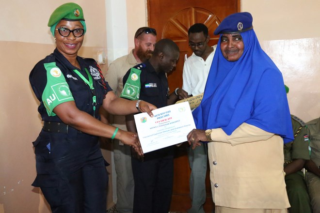 Evelyn a trainer from AMISOM police component, presents a certificate to one of the trainees during a training course on Improvised Explosive Devices (IED) & Explosive Ordinance Devices (EOD) for Southwest police forces, conducted by the African Union Mission in Somalia (AMISOM) in Baidoa, Somalia, on December 16, 2017. AMISOM Photo
