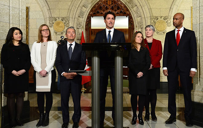 Prime Minister Justin Trudeau, middle, holds a press conference as he’s joined by his newly sworn in ministers, left to right: Karina Gould, Minister of Democratic Institutions; Francois-Philippe Champagne, Minister of International Trade; Chrystia Freeland, Minister of Foreign Affairs; Patty Hajdu, Minister of Labour; and Ahmed Hussen, Minister of Immigration, Refugees and Citizenship, on Tuesday, Jan 10, 2017, following a cabinet shuffle at Rideau Hall. (Sean Kilpatrick/CP)