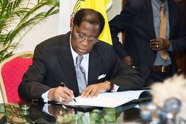 DR Congo Minister of Justice Alexis Thambwe Mwamba signs an accord at the inter diocesan centre in Kinshasa on January 1, 2017 following months of talks brokered by the Roman Catholic Church. PHOTO | AFP