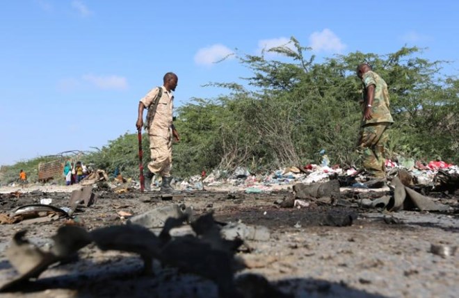 Somali soldiers inspect the scene of a suicide car bomb attack by al Shabab in Mogadishu, September 2016. FEISAL OMAR / REUTERS
