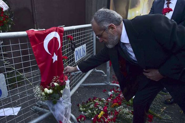 Turkish President's top advisor Yalcin Topcu lays flowers along the barricade in front of the Reina nightclub on January 2, 2017 in Istanbul, one day after a gunman killed 39 people. A suspect has been arrested. PHOTO | AFP