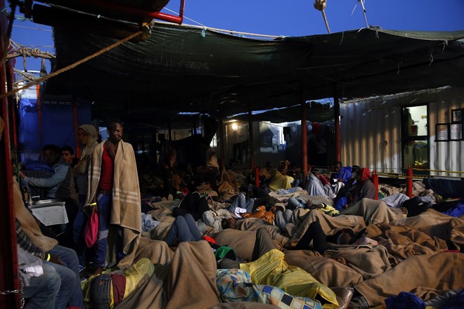 Migrants sleep on the deck of the rescue ship Vos Hestia, operated by Save the Children, as it heads for Sicily. The migrants, of several nationalities, were bound for Europe.