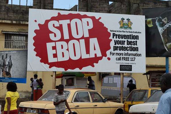 People walking past a billboard with a message about Ebola in Freetown on November 7, 2014. An estimated 17,000 survived the most recent outbreak. PHOTO | AFP