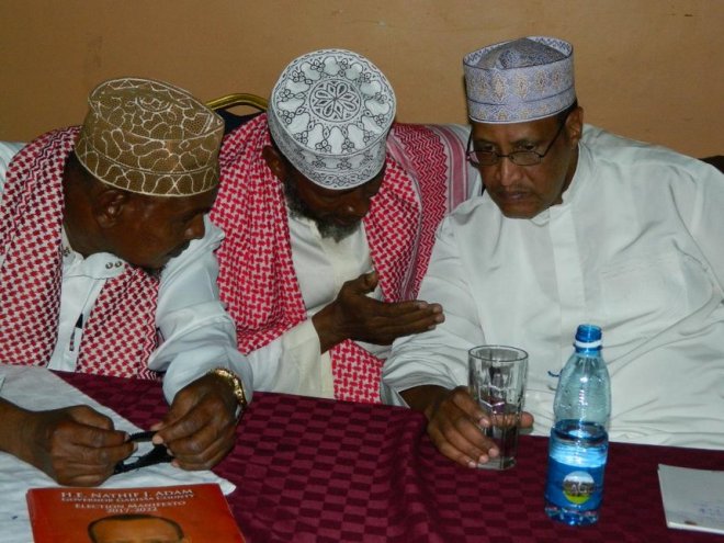 Sheikh Dadhane and Sheikh Abdi Noo Bishar have a word Garissa Governor Nathif Jama after endorsing his re-election bid in Garissa yesterday. / STEPHEN ASTARIKO