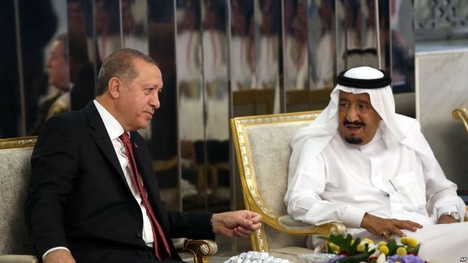 Turkey's President Recep Tayyip Erdogan, left, meets with Saudi King Salman, right, in Jiddah, Saudi Arabia, July, 23, 2017.