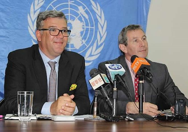 MOGADISHU (Xinhua) -- Richard Trenchard [left], Representative of Food and Agriculture Organization (FOA) in Somalia and Peter de Clercq, Deputy Special Representative of the Secretary-General for the United Nations Assistance Mission in Somalia (UNSOM) attend a press conference in Mogadishu, capital of Somalia. XINHUA PHOTO - FAISAL ISSE