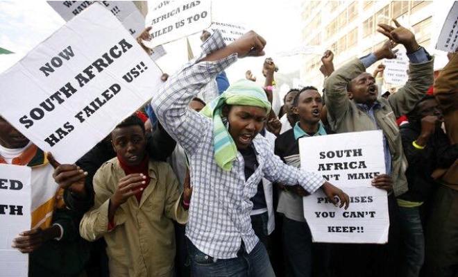 Somali nationals demonstrate outside Parliament in Cape Town against recent xenophobic attacks, and call for the United Nations High Commission on refugees to take over the running of relief centres, June 2, 2008. REUTERS/Mike Hutchings (SOUTH AFRICA)