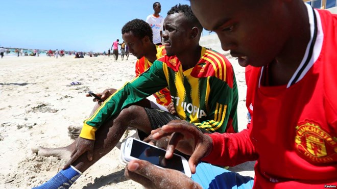 FILE - A Somali man browses the internet on his mobile phone at the beach along in Somalia's capital Mogadishu, Jan. 10, 2014.