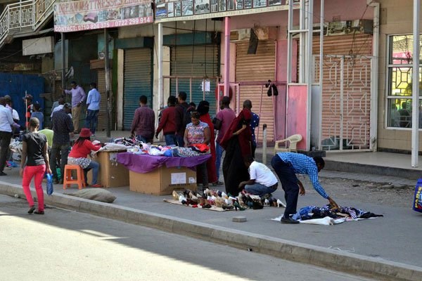Hawkers work along First Avenue in Eastleigh on March 2, 2017 despite being in running battles with shop owners for the past four days. The owners want hawkers removed from the streets. PHOTO | FRANCIS NDERITU | NATION MEDIA GROUP