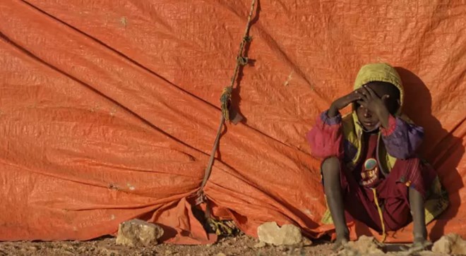 A Somali boy sits outside a makeshift hut at a camp for people displaced by droughtf in Somalia © AP