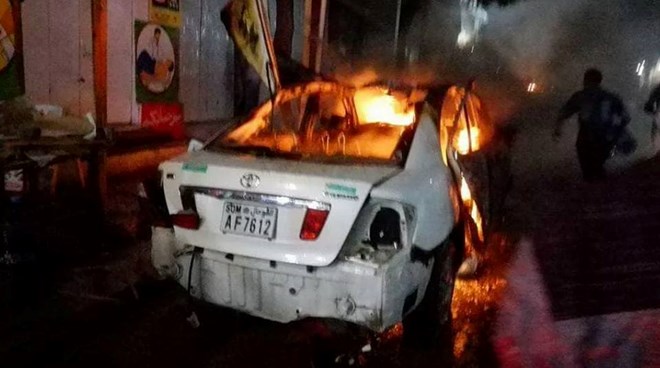 Rescue crews try to extinguish flames from a car. 11 people are reported injured after a car fitted with explosives was detonated at a busy intersection in Mogadishu on Nov 2, 2017. PHOTO: Abdifatah Mohamud