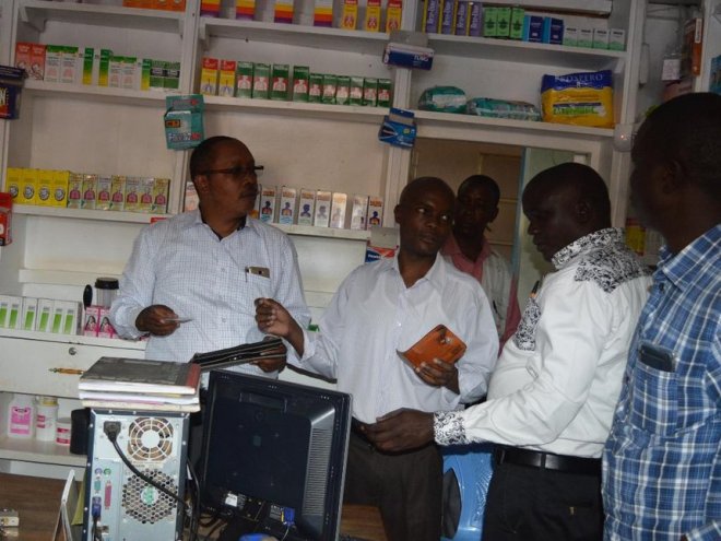 Pharmacy and Poisons Board officials led by North Rift Regional head Kibet Chebeo during crackdown on illegal pharmacies in Kisumu town on April 6, 2017. /MAURICE ALAL