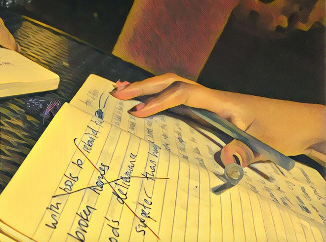 Amal Hussein and Hamdi Mohamed work on poems together. (Photo by Ian Coss with Prisma filter)
