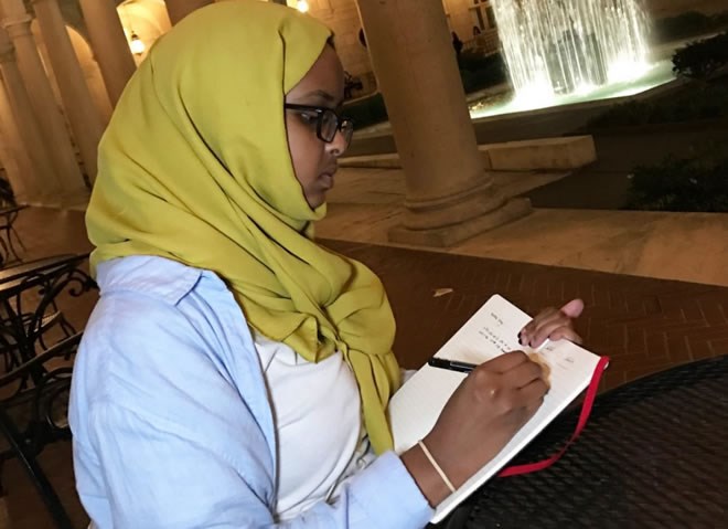 Hamdi Mohamed works on a poem at the Boston Public Library. She and Amal began writing together when they were in middle school. (Photo courtesy of Amal Hussein)