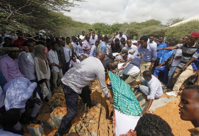 Somalis bury a body of a victim who died in Saturday's truck blast, in Mogadishu's Medina hospital graveyard in Mogadishu, Somalia, Tuesday, Oct, 17, 2017. A United States military plane has landed in Somalia's capital with medical and humanitarian aid supplies after Saturday's massive truck bombing killed more than 300 people. (AP Photo/Farah Abdi Warsameh)