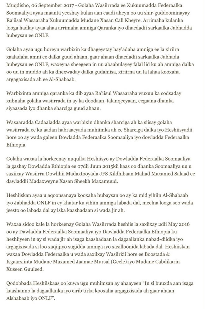 Pointing to a pair of agreements signed on June 7, 2015, and May 2, 2016, the Somali government said that it had entered into a security agreement with Ethiopia aimed at dismantling Al-Shabaab and ONLF operations in both countries. The documents also identified the two groups as “enemies” of Ethiopia and Somalia. The government said that the documents were signed by three former ministers - Mahad Mohamed Salad, Mohamed Jama Mursal Geelle, Abdikarim Guled before adding that they would be reviewing any agreements signed by the previous administration.