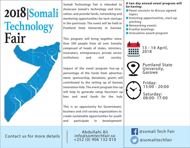 A week after some 500 youth participated in the country’s first mini-marathon in 20 years amid tight security, the Puntland Technology Development Agency is organising the first ever Somali Technology Fair on Friday.