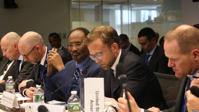 Somali Finance Minister Abdirahman Duale Beileh (center) is seen flanked by participants of International Monetary Fund (IMF) and World Bank meetings last week in Washington. (Twitter - @DrBeileh)