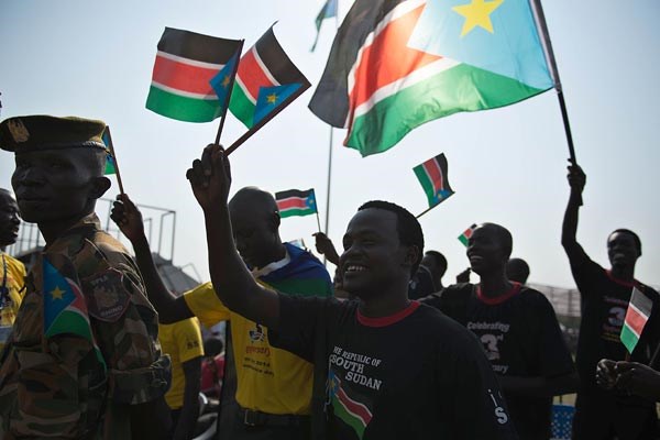 South Sudanese wave the flags of their country and dance to a celebratory song at the Dr John Garang Mausoleum as they celebrate the third anniversary of independence on July 9, 2014. PHOTO/AFP