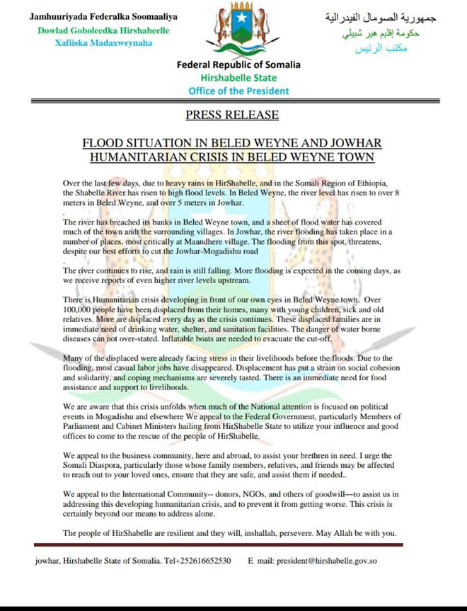President Ware said that torrential downpours have forced the banks of the Shabelle river to burst, washing away homes and livelihoods in the process.