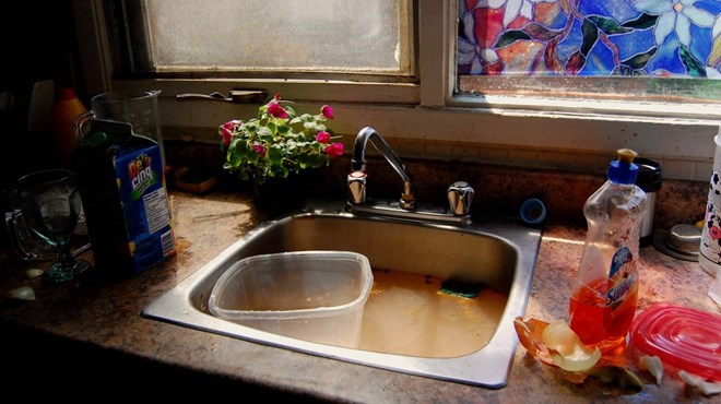 The kitchen sink is about half full of dirty, brownish water; the drain hasn't worked for the past year, and despite putting in a request to have it repaired five months ago, it's still blocked.