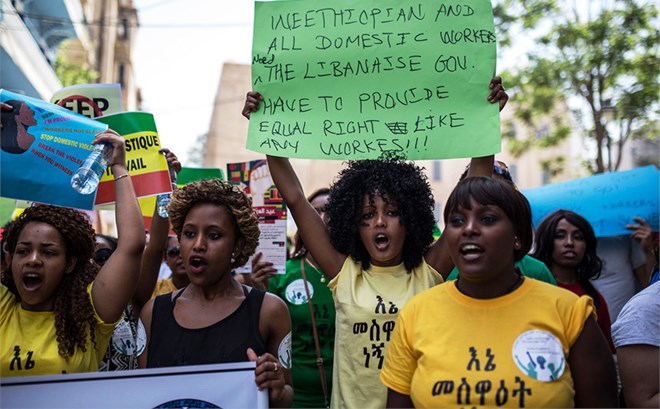 Hundreds of migrant domestic workers march in the Lebanese capital Beirut in May 2016. The domestic workers (house-maids) called for basic rights, including a minimum wage and at least one day off per week. Anne Paq/Al Jazeera