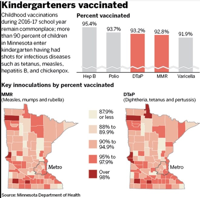 State records show that more than 90 percent of Minnesota children enter kindergarten vaccinated for infectious diseases such as tetanus, measles, hepatitis B, and chickenpox.