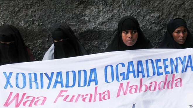 FILE - Ogaden National Liberation Front activists hold a banner in Mogadishu that reads, "The Ogaden freedom is the key to peace in the Horn of Africa," during a ceremony that marked the organization's 22nd anniversary in Somalia, Aug. 15, 2006