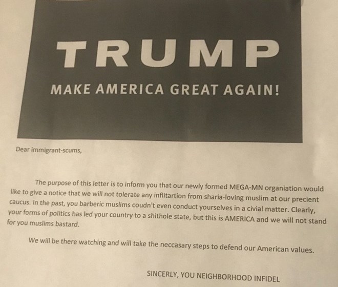 The typo-ridden fliers read that a new “MEGA-MN organiation [sic] would like to give a notice that we will not tolerate any inflitartion [sic] from sharia-loving muslims at our prescient [sic] caucus.” The statement continued with equally inflammatory and grammatically deficient lines.