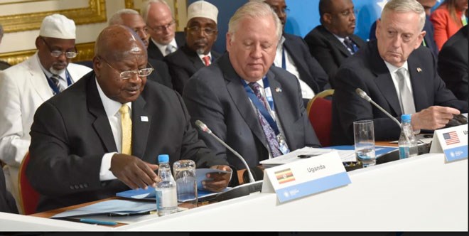 FILE PHOTO: President Museveni gives his Somalia prescription as US Defence Secretary Mattis looks on right at the London conference in 2017. He hosts AMISOM leaders this week