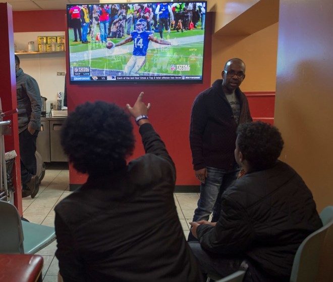 A group of young, avid football fans watch highlights of the Minnesota Vikings' postseason victory over the New Orleans Saints, at a popular Somali market, before the NFL's Super Bowl in Minneapolis, Minnesota, U.S. January 19, 2018. Picture taken January 19, 2018. REUTERS/Craig Lassig