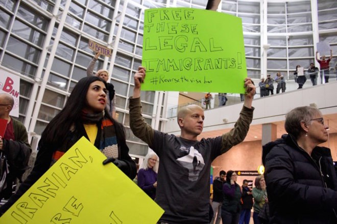 Mojan Payriz (left) and her husband, Christian Bennignus, joined thousands at a protest of Trump’s executive orders at Sea-Tac airport. (Photo by Venice Buhain/ Seattle Globalist)