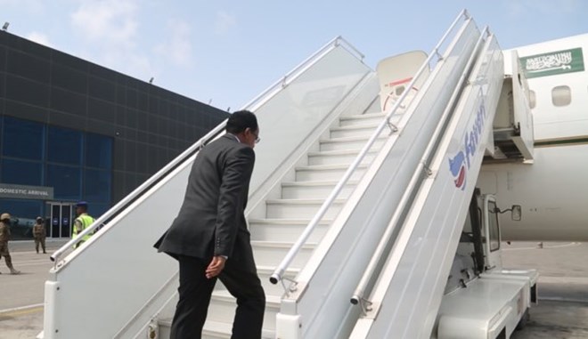 President Farmajo boards a plane at Aden Adde Airport in Mogadishu. Farmajo is in Kamapla attending a AMISOM Summit focused on transition. COURTESY: VILLA SOMALIA