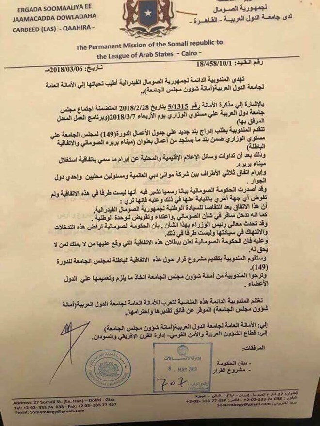 In a letter addressed to the regional organization of Arab states, the Federal Government of Somalia reiterates it's position that it was not a party to the tripartite agreement.