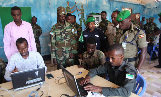Personnel of the African Union Mission in Somalia (AMISOM) Police Component carry out registration of the Darwish forces to integrate them into the Jubbaland state security forces in Kismayo, Somalia on 27 March 2018. AMISOM Photo
