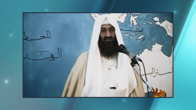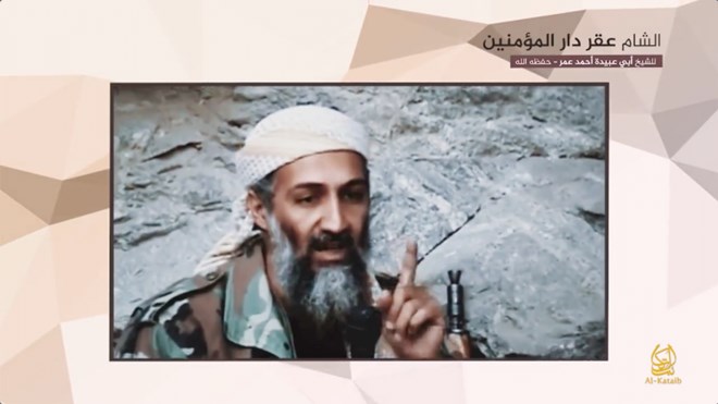 It is as this point that Al-Kata’ib Media’s video cuts to archival footage of bin Laden swearing that the US will not “enjoy security” before all of the “infidel armies” are forced to leave Muslims lands, including Palestine. (A screen shot of the footage can be seen above.)