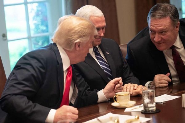 US President Donald Trump speaks (right) with Secretary of State Mike Pompeo as Vice President Mike Pence (centre) looks on during a meeting with NATO Secretary General Jens Stoltenberg in the Cabinet Room at the White House in Washington, DC, on May 17, 2018. Mr Pompeo has assured President Uhuru Kenya of the US support for Kenya's economic development and security. AFP PHOTO | NICHOLAS KAMM