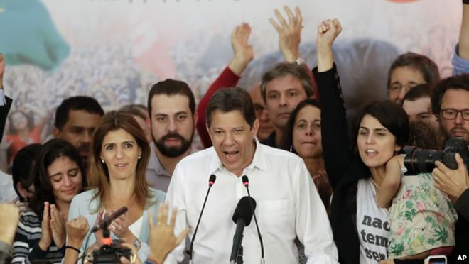 Workers' Party presidential candidate Fernando Haddad delivers his concession speech, in Sao Paulo, Brazil, Sunday, Oct. 28, 2018. Brazil’s Supreme Electoral Tribunal declared far-right congressman Jair Bolsonaro the next president of Latin America’s biggest country.